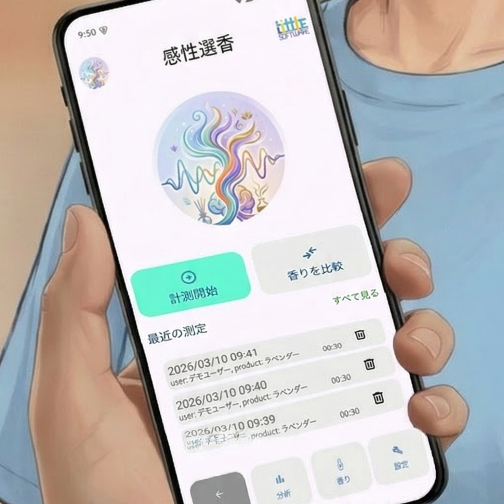 2017年にリリースした脳波×香り感情評価アプリ「感性選香™」を大幅にアップデートし、実店舗での接客や市場調査など、商用利用に特化したリニューアル版を用意しました。