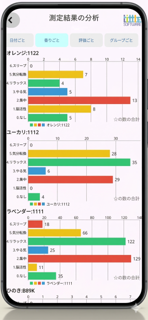 ←測定した結果は、「香り」や「感情や状態」毎に集計して、表示することが出来ます。